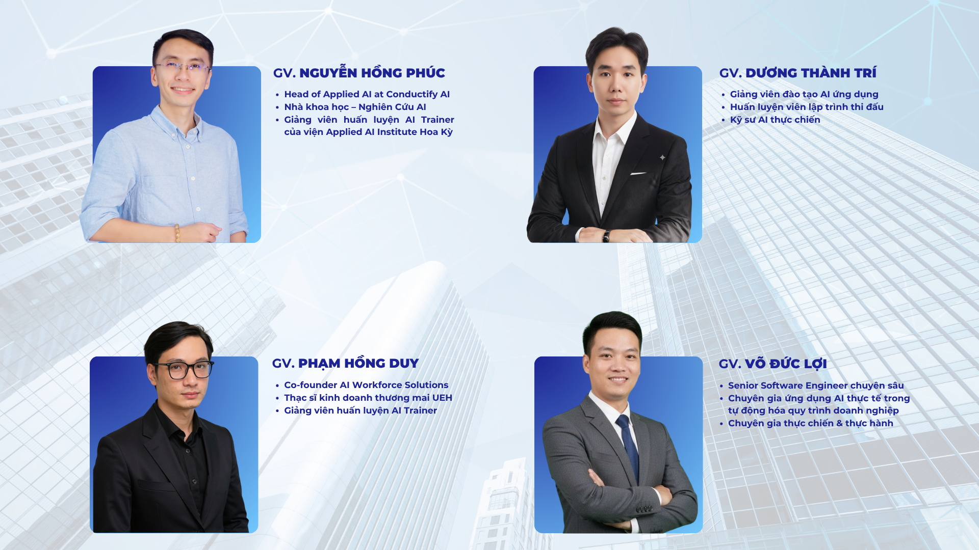 Bên cạnh đó, khóa học được dẫn dắt bởi 4 chuyên gia hàng đầu trong lĩnh vực AI, với kinh nghiệm thực tiễn và uy tín quốc tế: